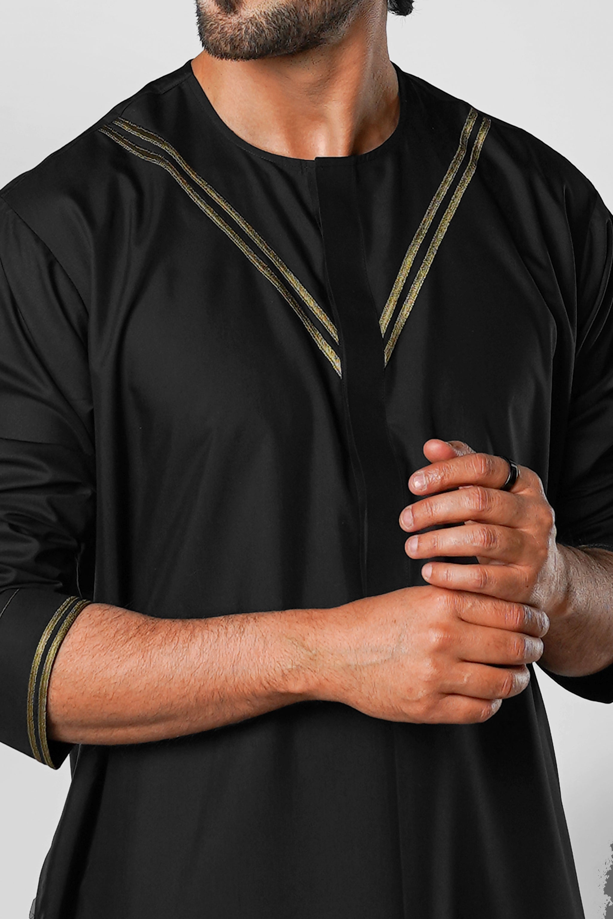 Are you looking for a classic black thobe that defines grace in every detail? Our black classic thobe with bronze embroidery is a stylish and trendy variant of traditional outfits. Its deep, smooth black finish reflects elegance, while the delicate bronze embroidery on the neckline adds an artistic edge.
