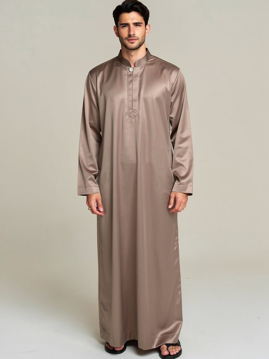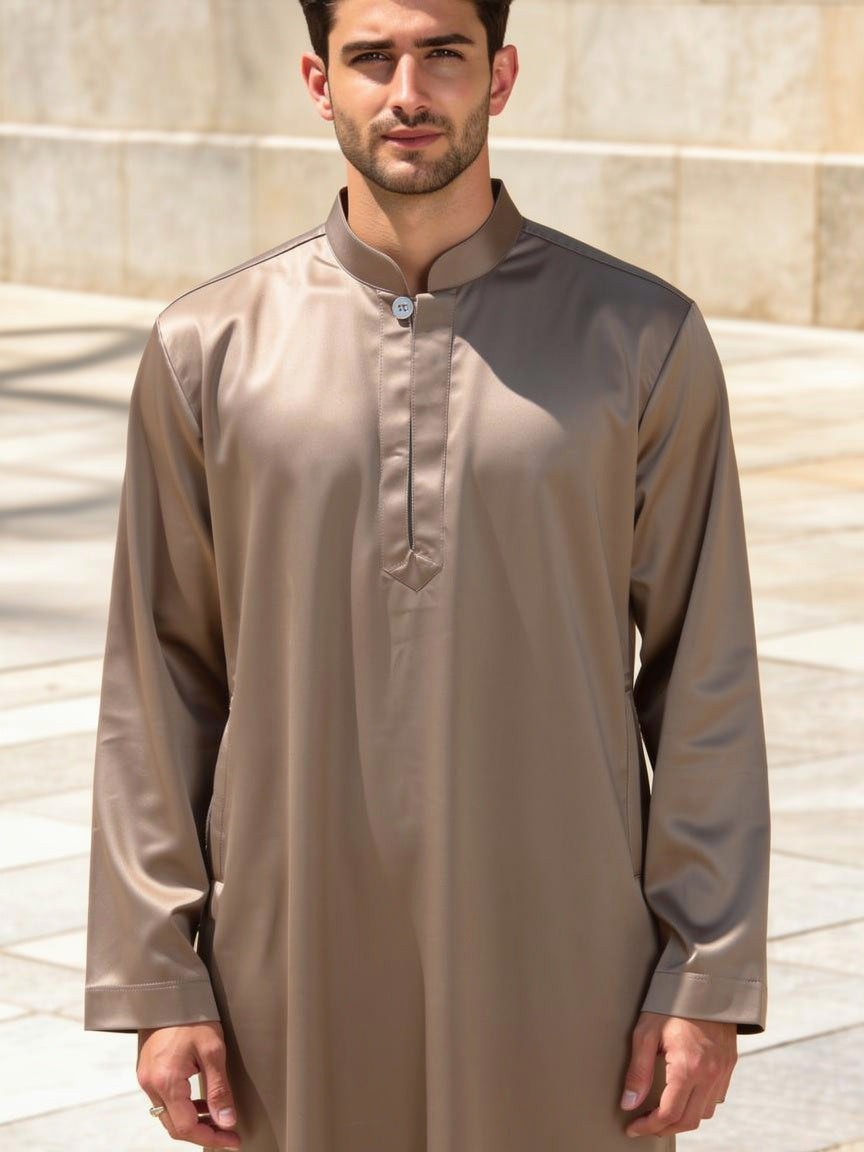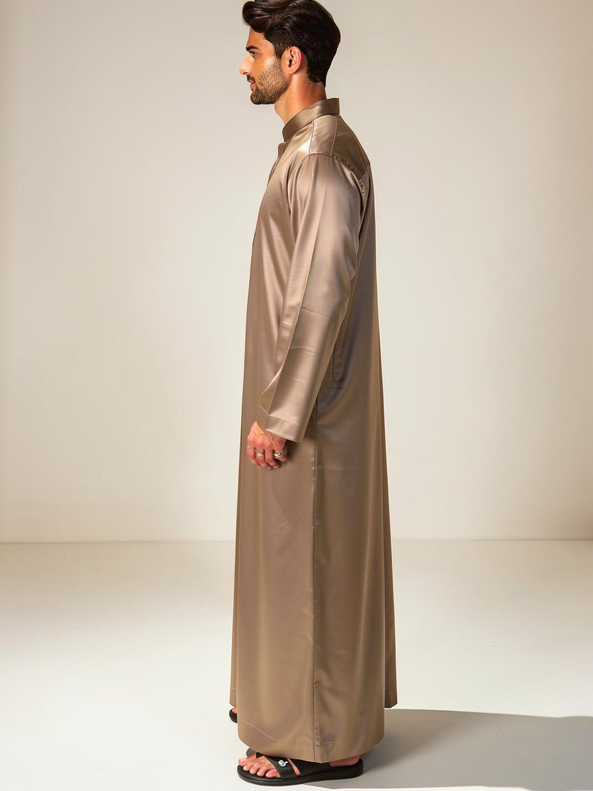 Look your best in our Silver Mink thobe, designed to give you a special and expensive look. The fabric has a beautiful metallic shine that catches the light, making it perfect for weddings or parties.This thobe features a neat mandarin collar and a simple, clean design. It is made from high-quality material that feels soft and looks very classy. If you want to stand out with a modern and polished style, this is the perfect choice for you.