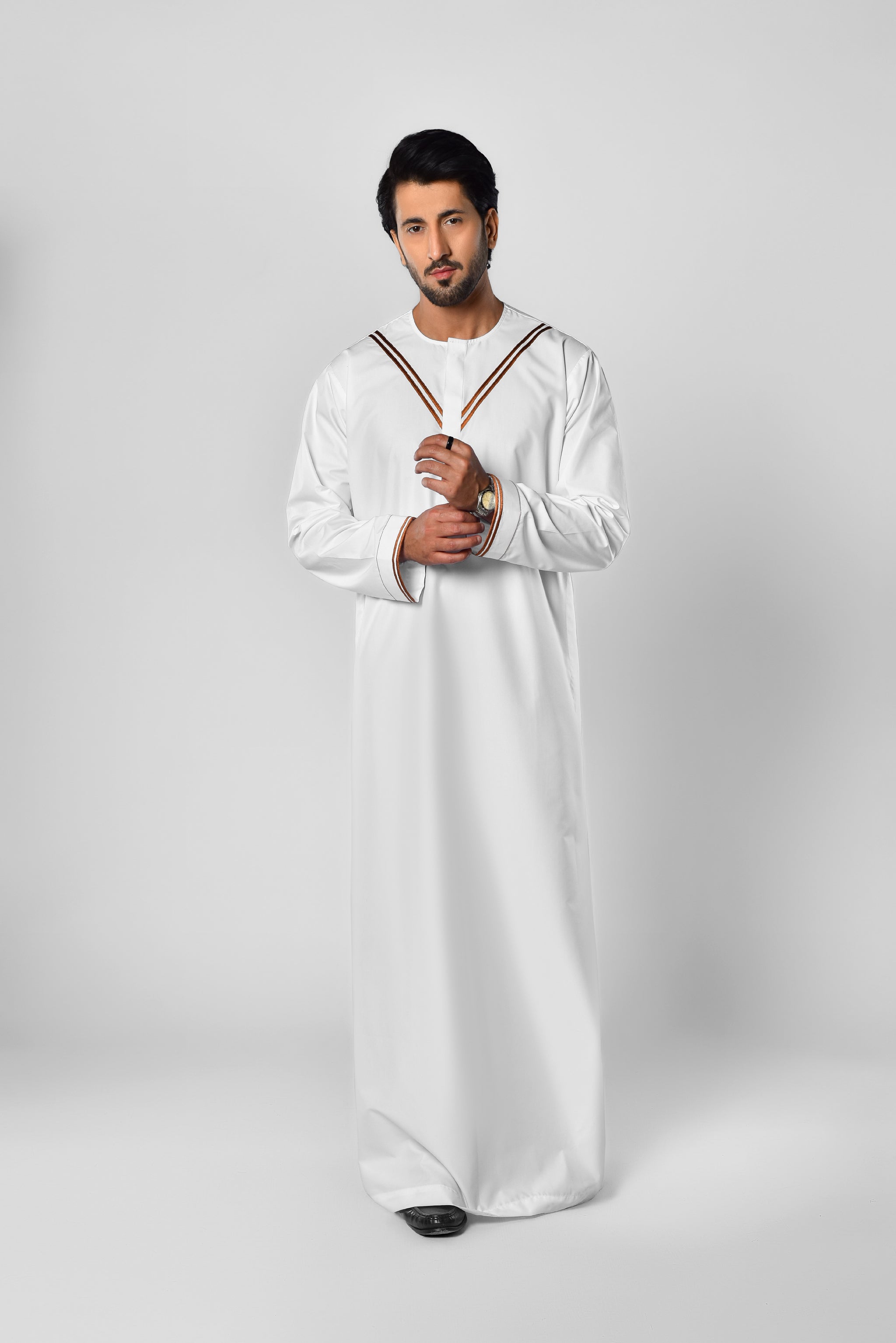 Step into sophistication with this white thobe, featuring exquisite bronze detailing for a sleek and contemporary look. Designed for the modern man, this piece blends timeless elegance with a fresh, stylish edge.